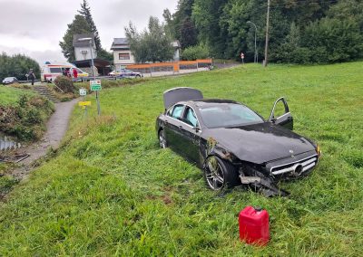 Nach der abgeschlossenen Unfallaufnahme durch die Exekutive bargen wir das Unfallfahrzeug mithilfe der Seilwinde unseres Tank 2, sodass es später rasch vom Abschleppunternehmen aufgeladen werden konnte. Während der Bergungsarbeiten musste die Fahrspur Richtung Zipf gesperrt und der Verkehr wechselseitig an der Unfallstelle vorbeigelotst werden. Mittels Ölbindemittel wurden ausgeflossene Betriebsmittel gebunden sowie die in die Unterführung ragenden Sträucher mit der Motorsäge entfernt. Anschließend konnte die verwüstete Fußgängerunterführung grob gesäubert und das defekte Geländer auf ein Fahrzeug des Gemeindebauhofs verladen werden. Dieser kehrte den Bereich später noch mit einer Kehrmaschine.